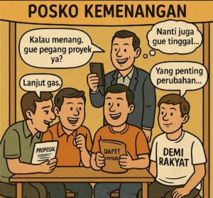 hingga relawan bayangan yang tak pernah muncul saat kerja tapi selalu siap saat “pencairan dana operasional”. Semua tersusun rapi, seperti organ dalam tubuh kampanye. Dan mereka bekerja, bukan hanya untuk memenangkan calon tapi untuk memastikan bagian masing-masing tetap aman di piring.