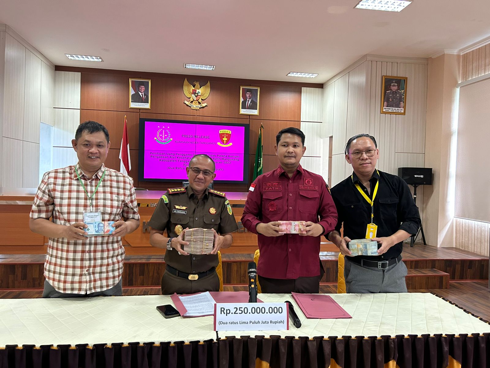 Uang pengganti kerugian negara tersebut diserahkan oleh tersangka M.Taufik melalui kuasa hukumnya sebesar Rp250 Juta. Uang titipan tersebut diterima oleh Kepala Kejari Tanggamus Adi Fakhruddin didampingi Kasi Pidsus Fathurrahman dan disaksikan pihak Bank BRI dan Penasehat Hukum (PH) M.Taufik, Rabu 9 Juli 2025.