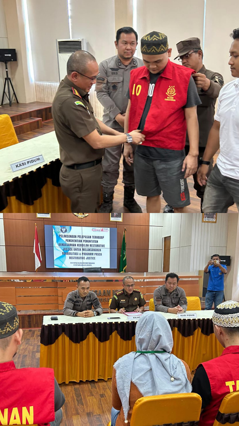 Penghentian penuntutan ditandai dengan pelepasan rompi tahanan dan penyerahan Surat Ketetapan Penghentian Penuntutan (SKP2) oleh Kepala Kejari Tanggamus, Adi Fakhruddin, Kamis 10 Juli 2025.