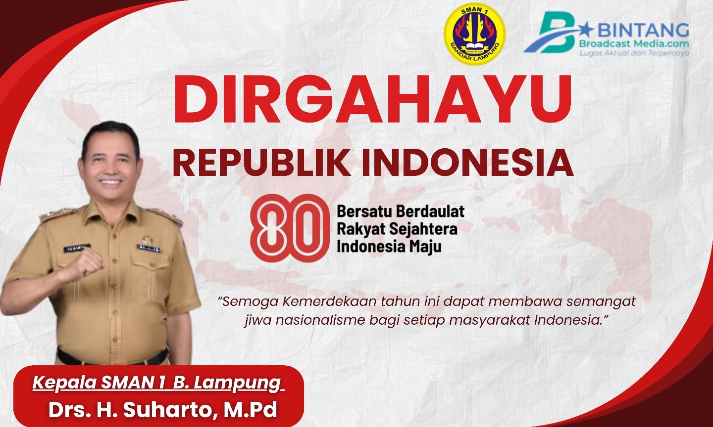 Bandar Lampung – Peringatan HUT ke-80 Republik Indonesia menjadi momen bersejarah yang penuh makna. Kepala SMAN 1 Bandar Lampung, Drs. H. Suharto, M.Pd., menyampaikan ucapan selamat sekaligus ajakan untuk terus menyalakan semangat nasionalisme di kalangan masyarakat, khususnya generasi muda.