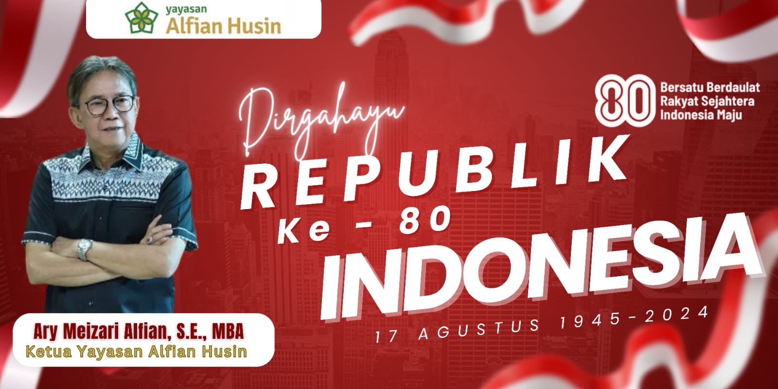 Bandar Lampung – Dalam rangka memperingati Hari Ulang Tahun (HUT) ke-80 Republik Indonesia, Yayasan Alfian Husin menyampaikan ucapan selamat dan doa terbaik untuk Indonesia agar semakin maju, sejahtera, dan berdaulat.