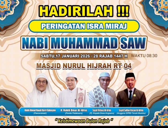 Tanah Bumbu, Kalimantan Selatan — Bintang Broadcast Media Dalam rangka menjemput keberkahan Bulan Rajab serta menghidupkan syiar Islam, masyarakat Desa Angsana, Kecamatan Angsana, Kabupaten Tanah Bumbu, akan menggelar Peringatan Isra Mi’raj Nabi Muhammad SAW 1447 Hijriah pada Sabtu, 17 Januari 2026, bertempat di Masjid Nurul Hijrah RT 04.