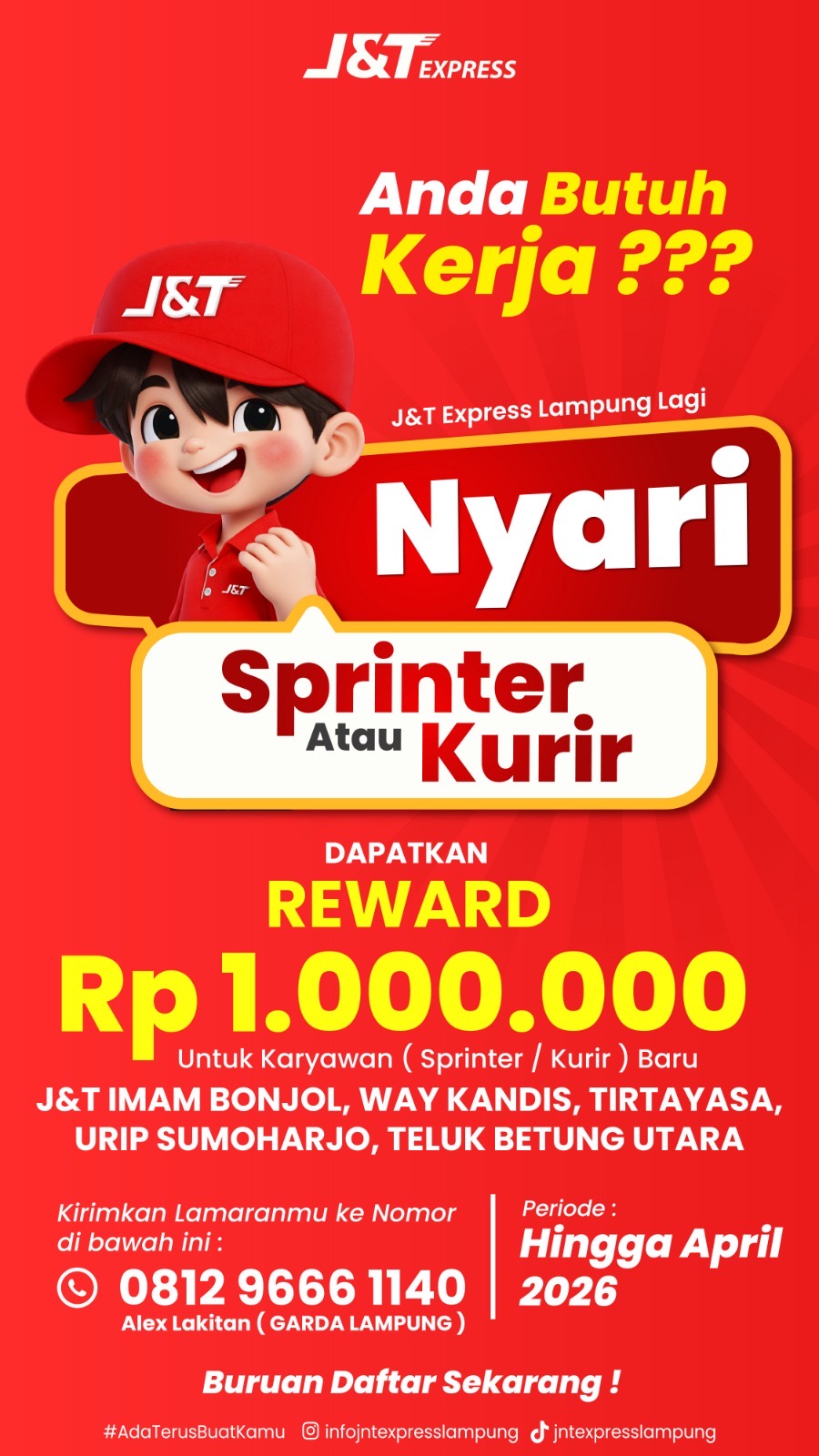 Bandar Lampung — Perusahaan jasa pengiriman J&T Express membuka lowongan kerja untuk posisi sprinter atau kurir di sejumlah wilayah Bandar Lampung.